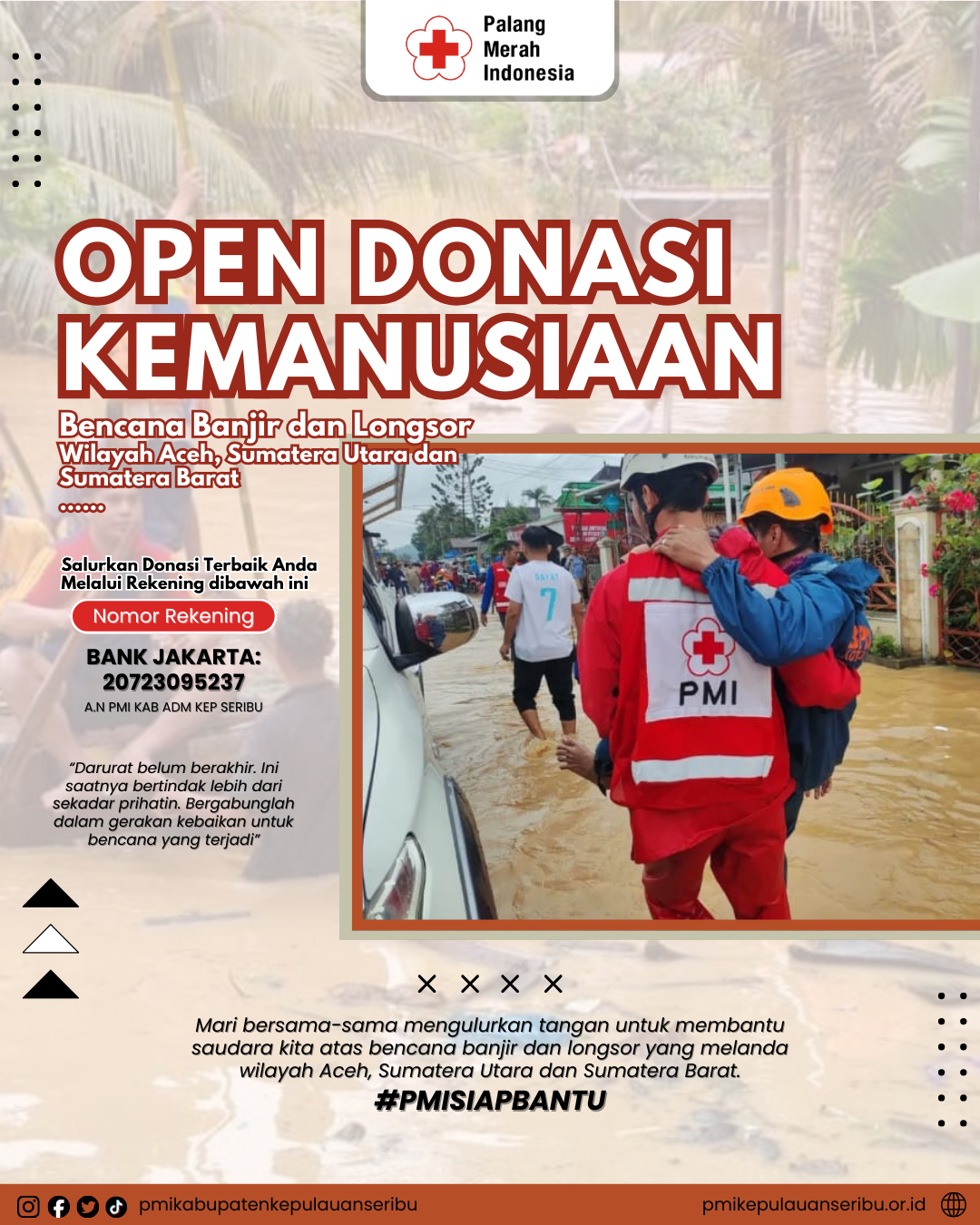 Palang Merah Indonesia (PMI) Kabupaten Kepulauan Seribu mengumumkan pelaksanaan penggalangan dana kemanusiaan untuk membantu korban bencana banjir dan longsor di Aceh, Sumatera Barat, dan Sumatera Utara. Kegiatan ini akan berlangsung selama tiga hari, mulai Rabu-Jum’at, 3-5 Desember 2025